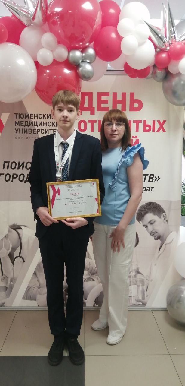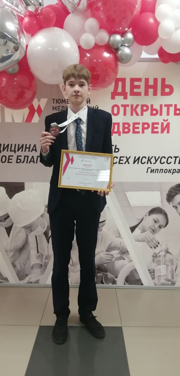 В рамках дня открытых дверей В ТЮМЕНСКОМ МЕДИЦИНСКОМ УНИВЕРСИТЕТЕ прошла церемония награждения победителей и призеров межрегиональной многопрофильной олимпиады школьников «Менделеев». Ученик 9 а класса Мельников Павел в течении 3 лет успешно проходит заочные и является призером очного этапа олимпиады по направлению «Метаболон». Павел награжден дипломом 3 степени и получает дополнительные баллы при поступлении в данный ВУЗ.