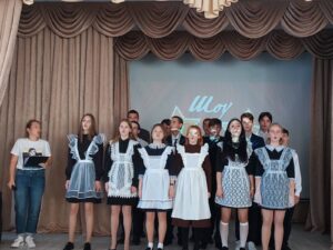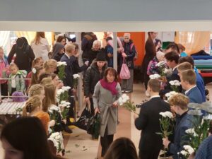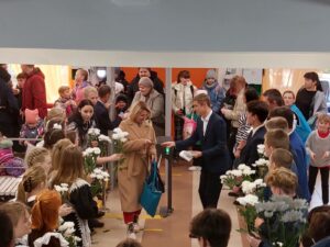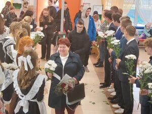 При входе в школу всех педагогов встречает живой коридор из выпускников школы! Ребята вручают цветы, благодарности и открытки.