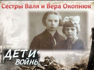 Девочек звали Валя и Вера Окопнюк. Они были сестрами. Валя постарше, ей уже исполнилось тринадцать лет, а Вере было только десять. Мама девочек умерла еще до войны, а когда началась война, папа ушел на фронт. Дети остались совсем одни, соседи помогали сестрам. Валя и Вера дежурили на крышах домов, гасили зажигательные бомбы, помогали больным и старым людям спускаться в бомбоубежище. Когда город захватили немцы, девочки увидели и испытали все ужасы оккупации. Сестры сбежали в Киев. Здесь они помогали санитарам в госпитале, научились делать перевязки, кормили раненых. А в свободное время устраивали для бойцов концерт: читали стихи, пели под гитару песни, танцевали. После окончания войны отец нашел девочек.