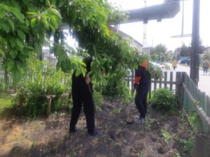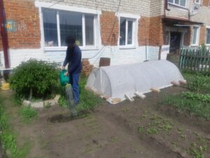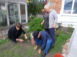 Мальчишки подкопали землю, пропололи и полили грядки, очистили от сорняка под яблонькой, при этом с удовольствием общались с добродушной хозяйкой.