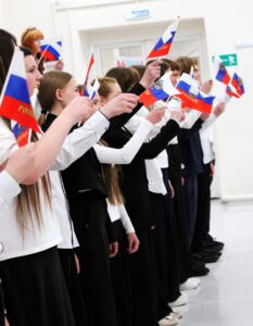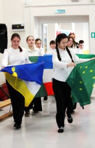 Они развернули флаги всех республик Российской Федерации, символизируя наше многообразие и единство. Все исполнили гимн, объединивший нас в едином порыве.