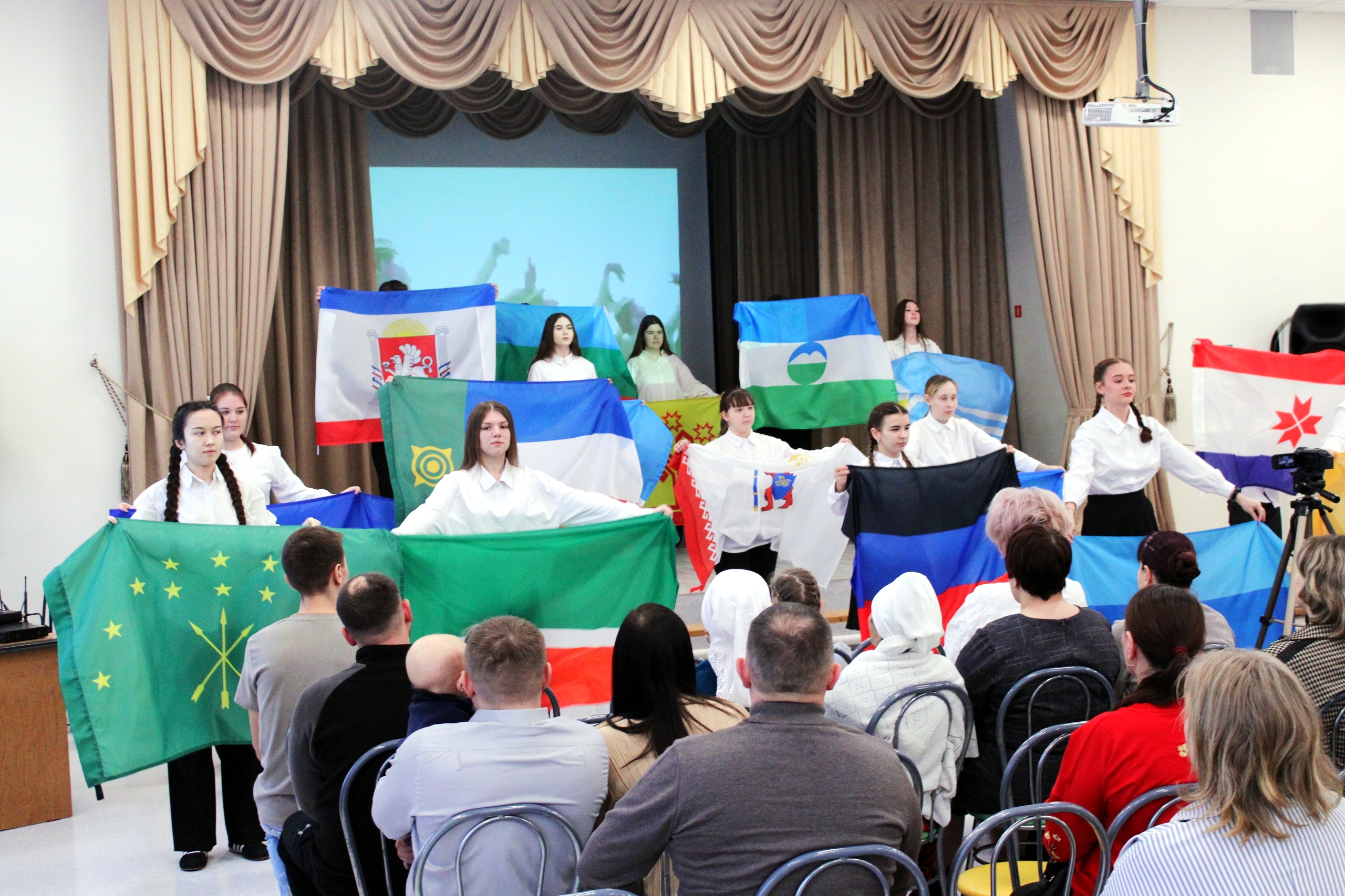 Они развернули флаги всех республик Российской Федерации, символизируя наше многообразие и единство. Все исполнили гимн, объединивший нас в едином порыве.