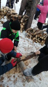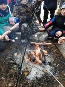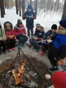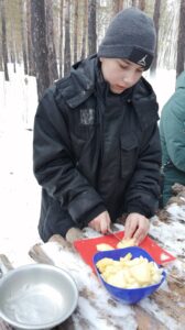 Сегодня учащиеся 5 «а» класса вместе с классным руководителем Мекаевой Е. А. и педагогом доп. образования Мельниковым Н. Г. сходили в зимний поход! Тёплые солнечные лучи, комфортная температура воздуха , безветренность были нашими спутниками. Мы с удовольствием искали и рассматривали следы диких животных, учились разжигать костёр, заготавливать дрова, варить суп, жарить сосиски и делать печёнки!