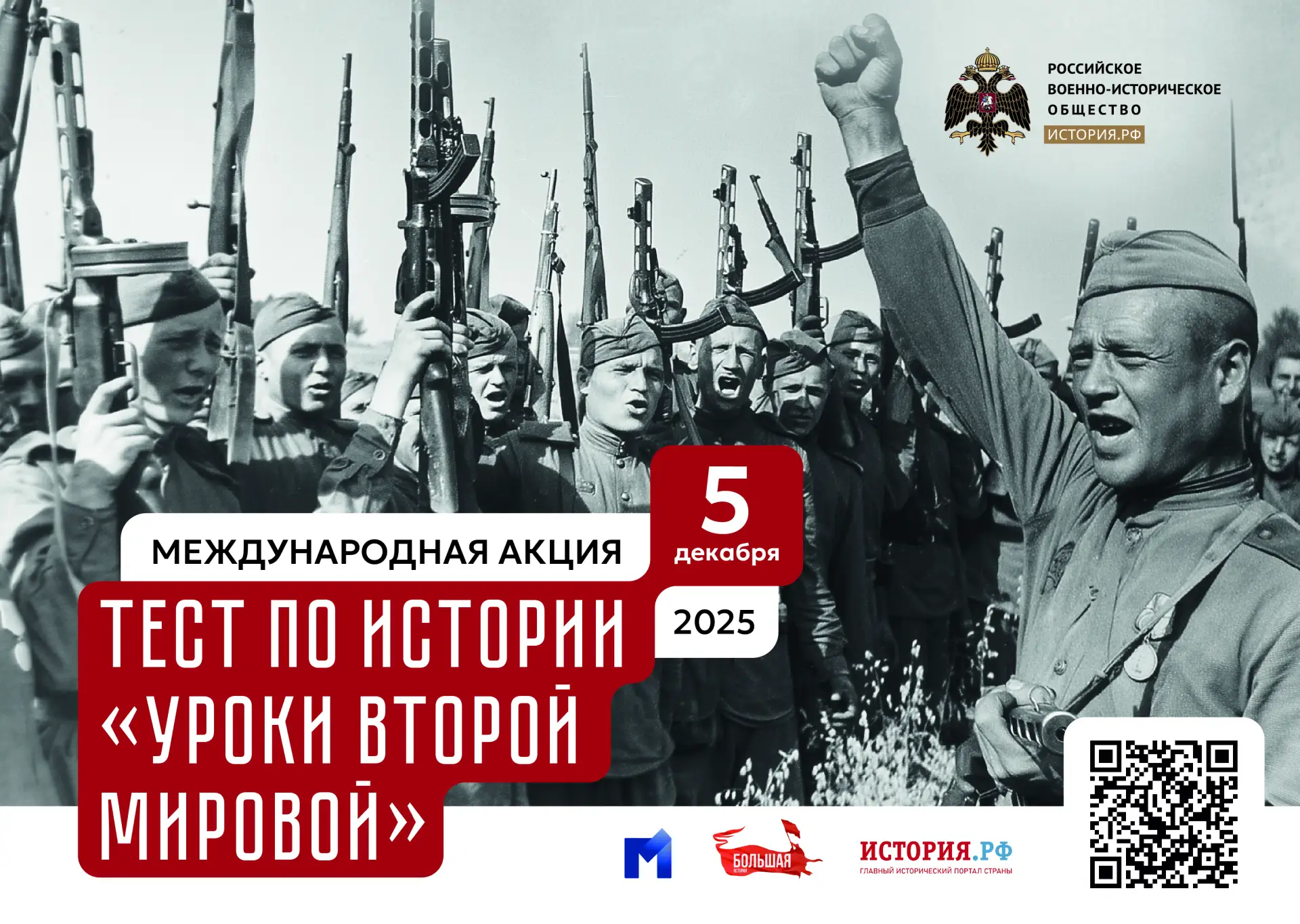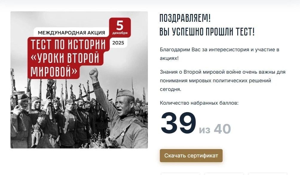 Ежегодно в России проходит Международная акция «Тест по истории «Уроки Второй мировой». Инициаторами и организаторами акции являются Молодежные парламенты России совместно с Российским военно-историческим обществом. В этом году Тест посвящен Урокам Второй мировой войны и охватывает период с 1939 по 1945 год.