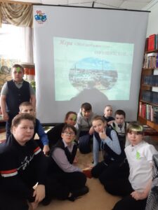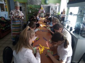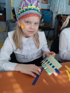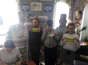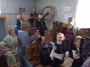 В зале «русская изба» познакомились с бытом, посмотрели как жили наши предки, попробовали себя в самом популярном ремесле нашего района-ковроткачестве. И пусть это была обыкновенная цветная бумага, но техника выполнения была понятна всем.