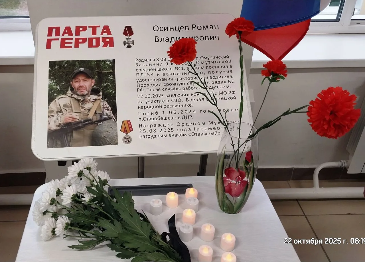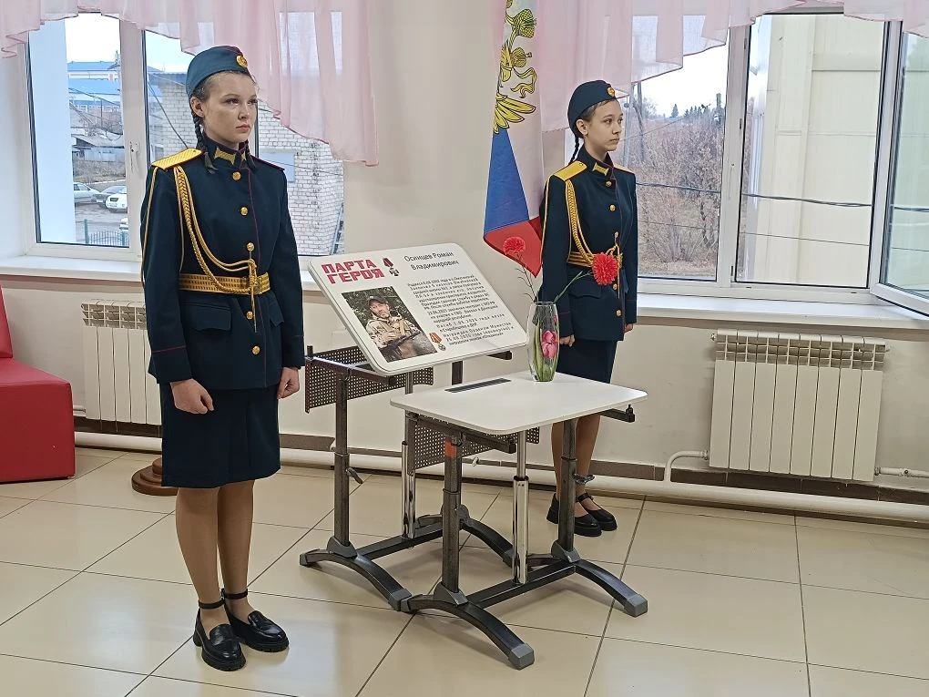 Наша школа богата историей и своими традициями. Есть светлые, торжественные страницы, но есть и скорбные, печальные. Сегодня мы склоняем головы в память героя, ученика нашей школы Осинцева Романа Владимировича, отдавшего жизнь на специальной военной операции на Украине.За заслуги перед Отечеством Роман Владимирович награжден нагрудным знаком «Отважные»и Орденом мужества. 22 октября состоялось торжественное открытие парты Героя. На церемонии присутствовали дети, родные и друзья Героя. Со слезами на глазах возложили цветы, зажгли свечи, почтили память минутой молчания.