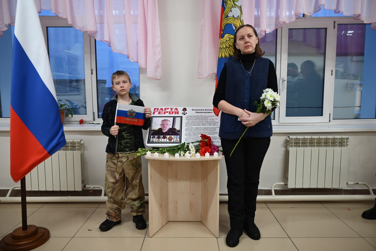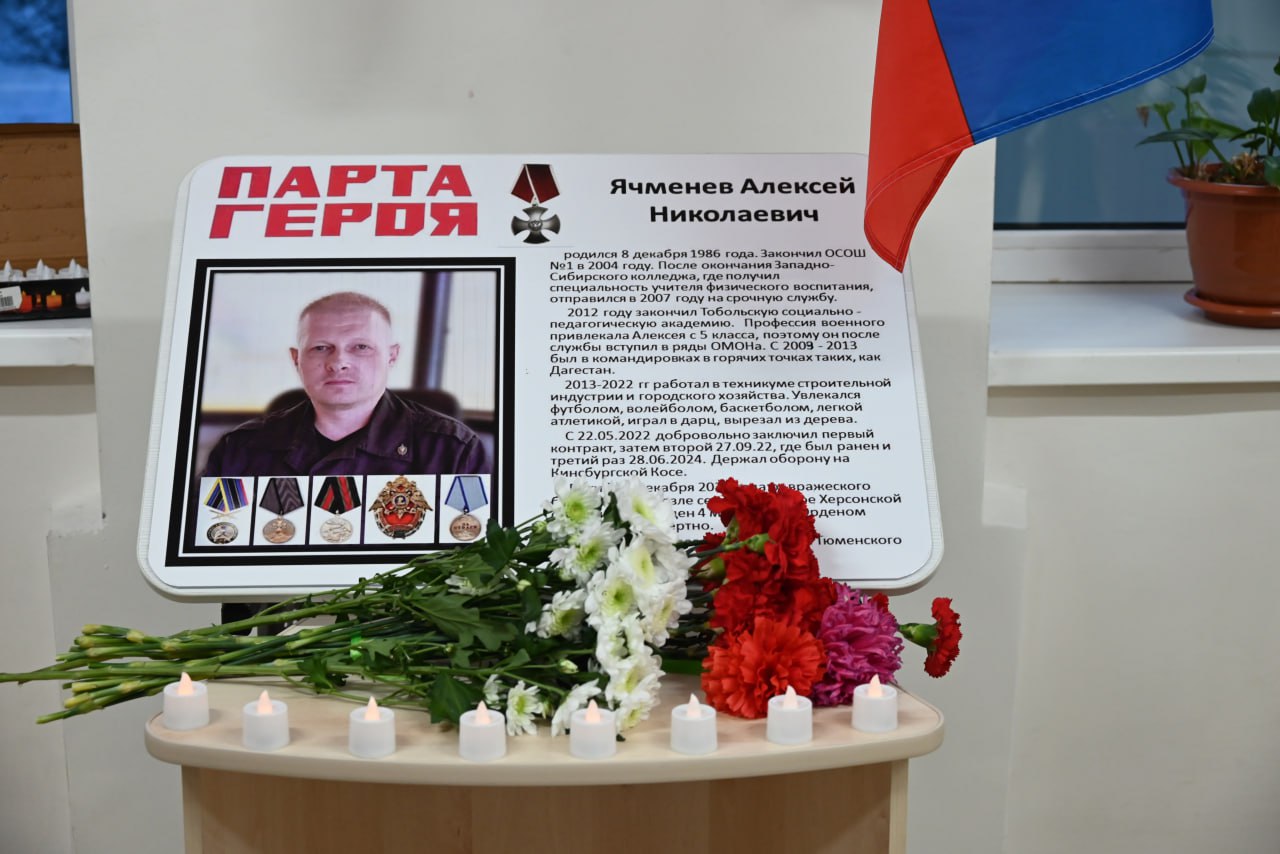 Затем состоялось открытие «Парты героя» — особого символа благодарности и памяти. На ней размещены фотографии Алексея Николаевича, погибшего при исполнении воинского долга. Родители и жена Героя присутствовали на мероприятии, выслушали тёплые слова благодарности и поддержки. Перед учащимися выступили председатель Совета ветеранов Омутинского района Абросимова Нина Валентиновна и одноклассница Алексея, Аксенова Елена Юрьевна, поделившаяся личными воспоминаниями о однокласснике.
