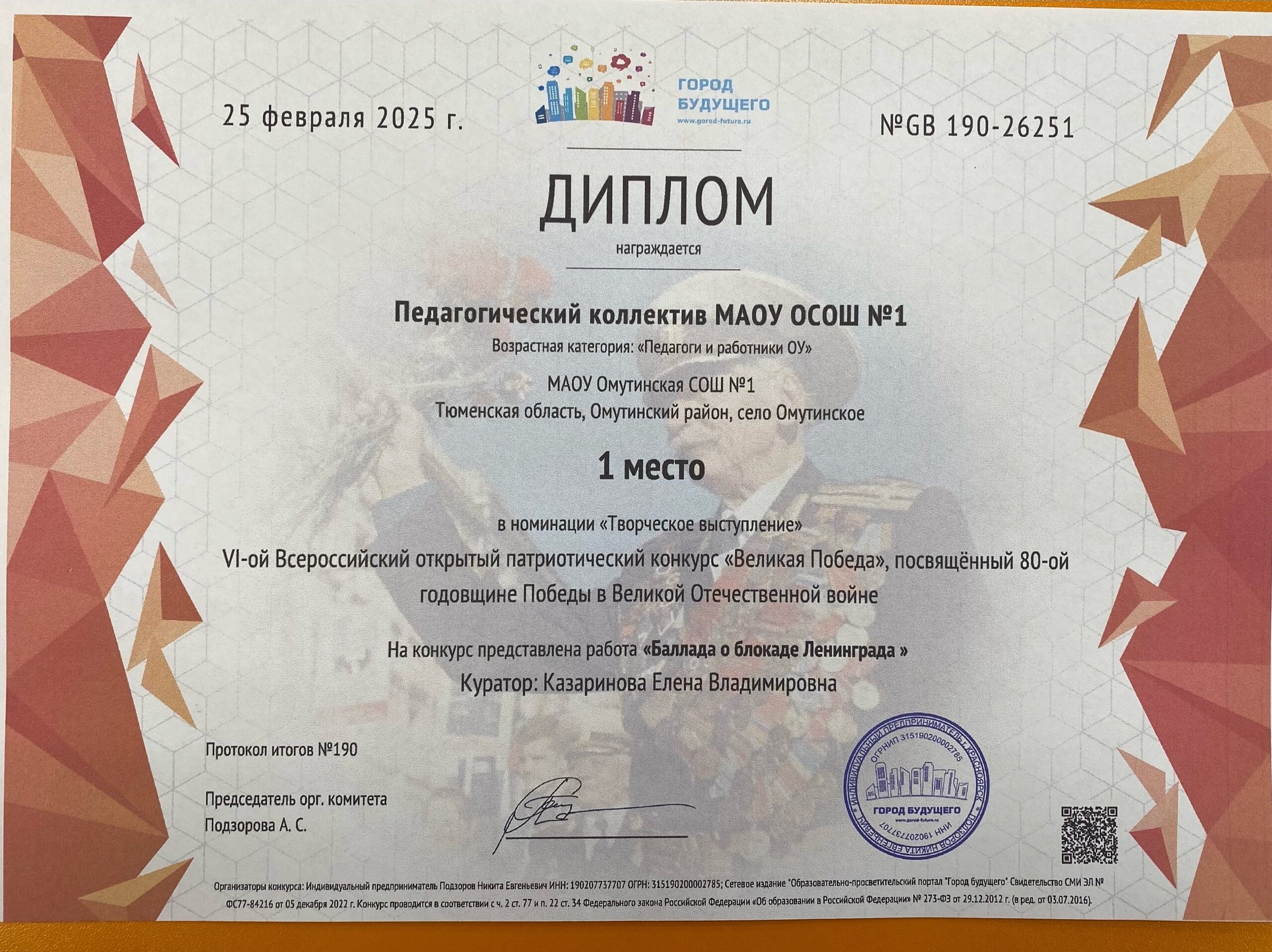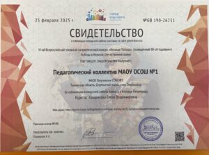 Педагогический коллектив МАОУ ОСОШ №1 занял 1 место в 6 — ом Всероссийском открытом патриотическом конкурсе «Великая Победа», посвященном 80-ой годовщине Победы в Великой Отечественной войне.