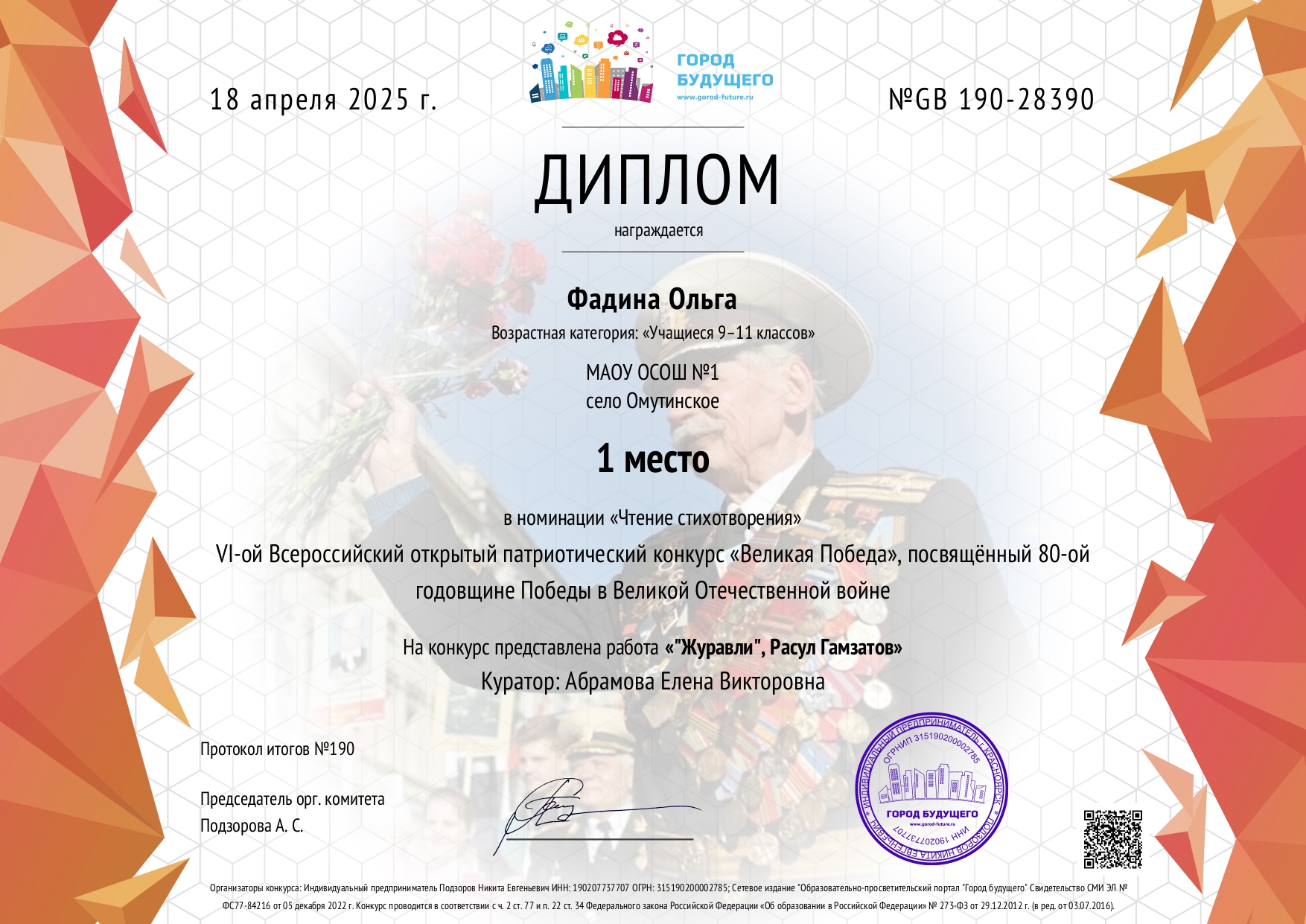 Евстафьева Ксюша и Фадина Оля, учащиеся 9 «б» класса, стали победителями в VI-ом Всероссийском открытом патриотическом конкурсе «Великая Победа», посвящённом 80-ой