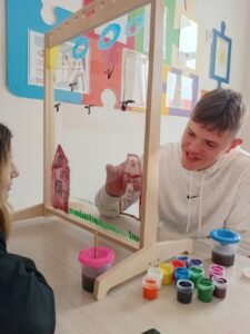 Рисование на прозрачном мольберте в ходе коррекционно-развивающих занятий раскрывает в детях то, что с помощью общения не всегда удается. Рисуя на стекле, даже агрессивный, конфликтный ребенок получает возможность установить непосредственный контакт с другим человеком (родителем, одноклассником, учителем). В отличие от рисования на бумаге, стекло дарит новые визуальные впечатления и тактильные ощущения. Учащихся любого возраста захватывает сам процесс рисования: гуашь (именно ее свойства лучше подходят для рисования по стеклу) скользит мягко, ее можно размазывать и кистью, и пальцами, так как она не впитывается в материал поверхности и долго не высыхает.