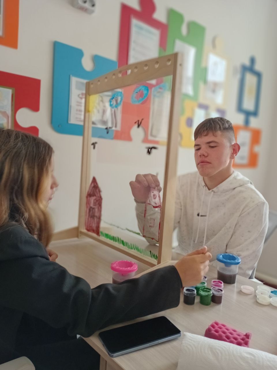 На фото представлен фрагмент занятия «Город счастья». Подростки рисуют дома, в которых живет добро, тепло, уют и взаимопонимание.