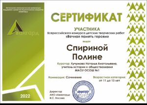 Ученица 6 «в» класса МАОУ ОСОШ №1 Спирина Полина приняла участие во Всероссийском конкурсе «Вечная память героям» , посвященному Дню Победы, 9 мая в номинации «Сочинение — эссе».