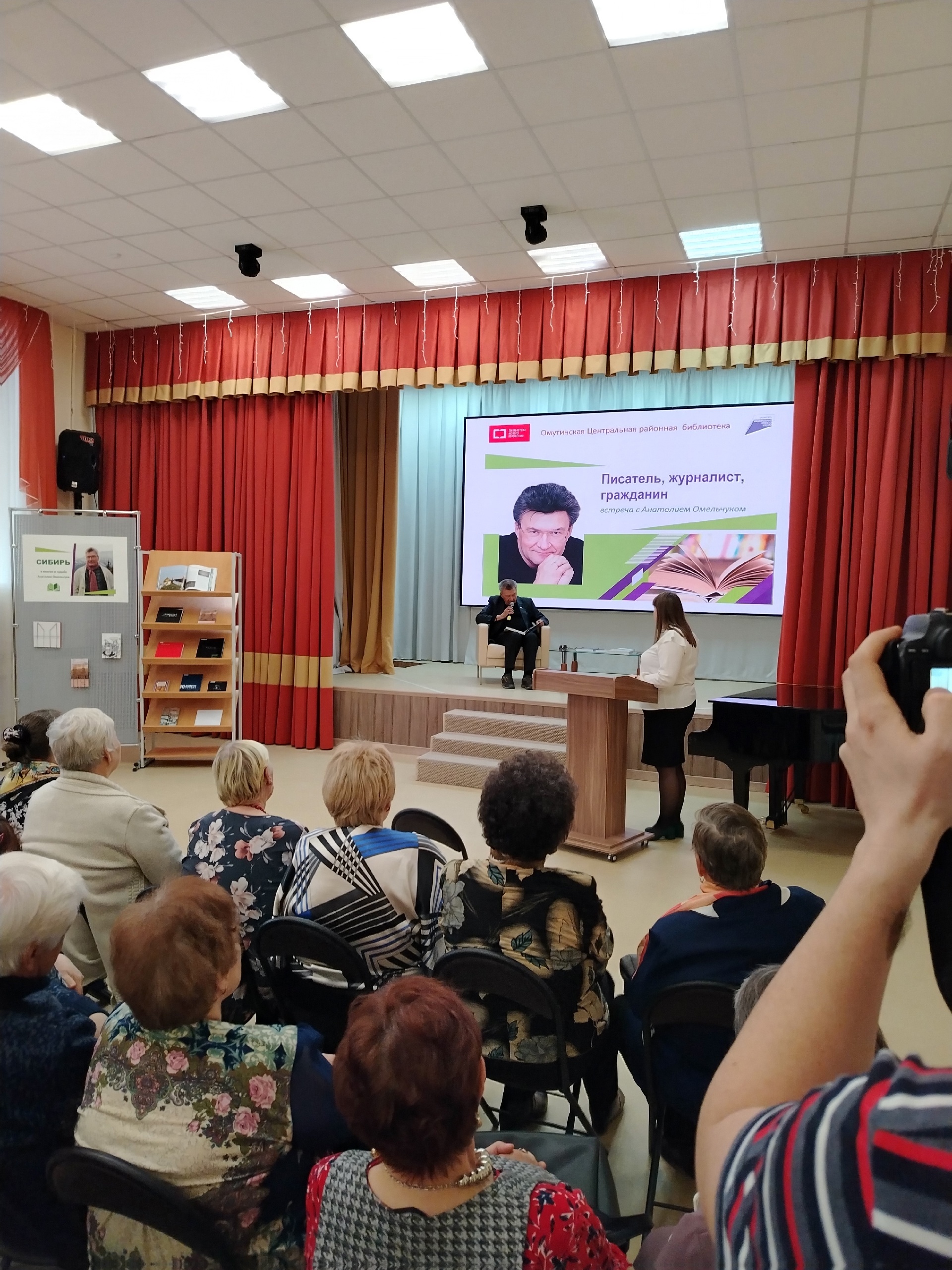 Сегодня учащиеся 11а класса посетили центральную районную библиотеку, где состоялась очередная встреча с Анатолием Константиновичем Омельчуком — советским и российским писателем, журналистом и медиаменеджером. Анатолий Константинович является автором 40 книг прозы, поэзии, публицистики и эссеистики о любви к Сибири. Писатель представил свою новую книгу. «Родина твоего счастья» — это книга моих путешествий и открытий, — поделился Омельчук.